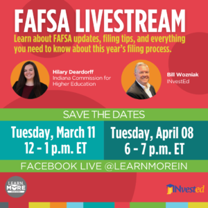 We’re excited to announce that Learn More Indiana is back with FAFSA livestreams! Have your questions answered by FAFSA experts from the Indiana Commission for Higher Education and INvestEd. Be sure to mark your calendars and join us on the Learn More Indiana Facebook page.
